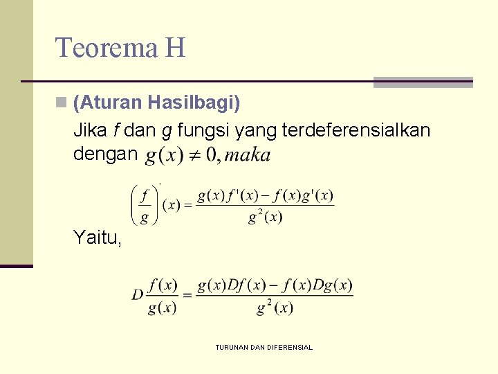 Teorema H n (Aturan Hasilbagi) Jika f dan g fungsi yang terdeferensialkan dengan Yaitu, TURUNAN DIFERENSIAL