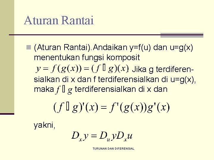 Aturan Rantai n (Aturan Rantai). Andaikan y=f(u) dan u=g(x) menentukan fungsi komposit. Jika g terdiferensialkan di x dan f terdiferensialkan di u=g(x), maka terdiferensialkan di x dan yakni, TURUNAN DIFERENSIAL