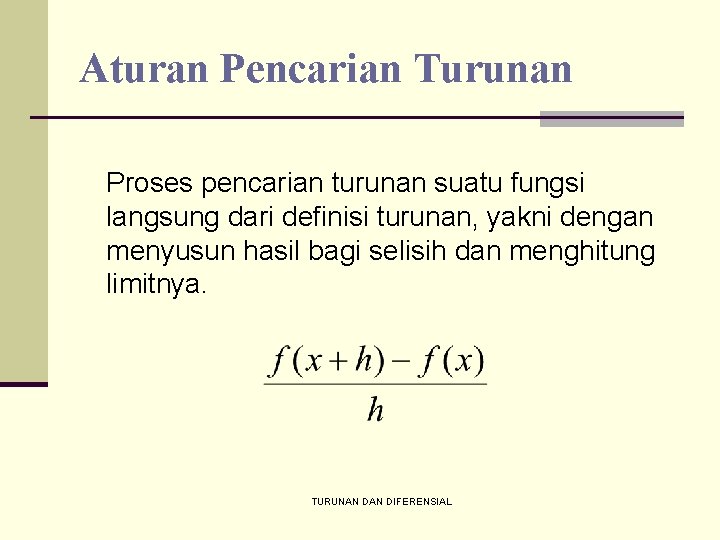 Aturan Pencarian Turunan Proses pencarian turunan suatu fungsi langsung dari definisi turunan, yakni dengan menyusun hasil bagi selisih dan menghitung limitnya. TURUNAN DIFERENSIAL