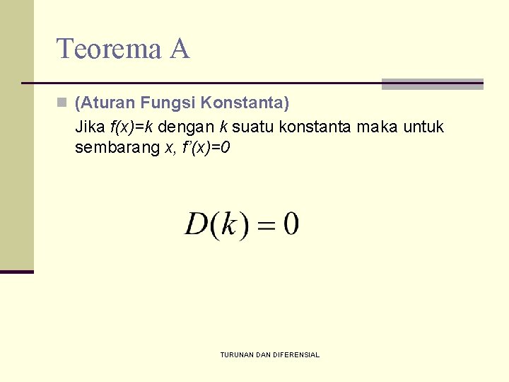 Teorema A n (Aturan Fungsi Konstanta) Jika f(x)=k dengan k suatu konstanta maka untuk sembarang x, f’(x)=0 TURUNAN DIFERENSIAL