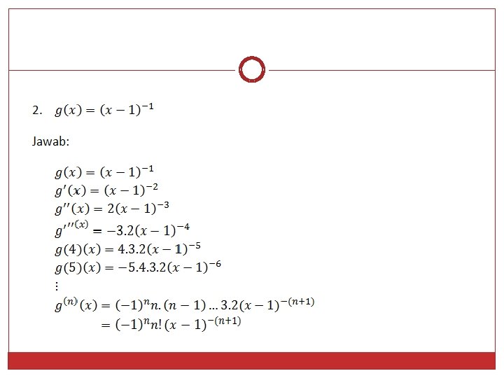 Contoh Fungsi f ---->f’’ (f dua aksen) atau (turunan ke-2 dari f ) ->f’’’ ydst. . = 6 x 3 + 12 x 2 + 5 x + 2 d 3 y/dx 3 = ……? dy/dx = 18 x 2 + 24 x + 5 3 =3 36 a. (x) 2 = 36 x + 24. = – 4 x 2 + 7 x – 8 d 2 fy/dx d 3 y/dx 2 x f‘ (x) = 6 x 2 – 8 x + 7 f”(x) = 12 x – 8 f‘” (x) = 12 f” ” (x) = 0 karena turunan fungsi nol adalah 0, maka secara turunan tingkat yang lebih tinggi akan menjadi “nol” b. Tentukan turunan ke 3 dari fungsi y = 6 x 3 + 12 x 2 + 5 x + 2 dy/dx = 18 x 2 + 24 x + 5 d 2 y/dx 2 = 36 x + 24. d 3 y/dx 3 = 36