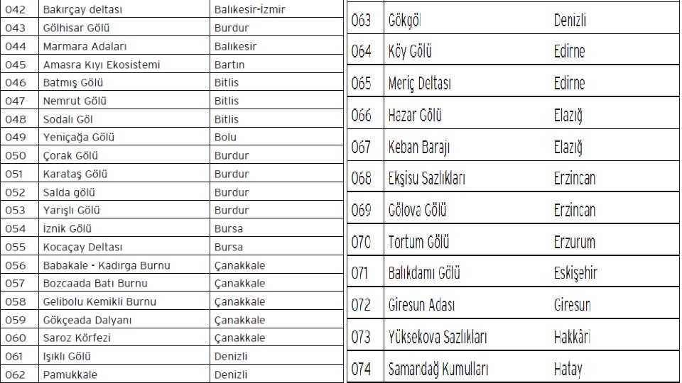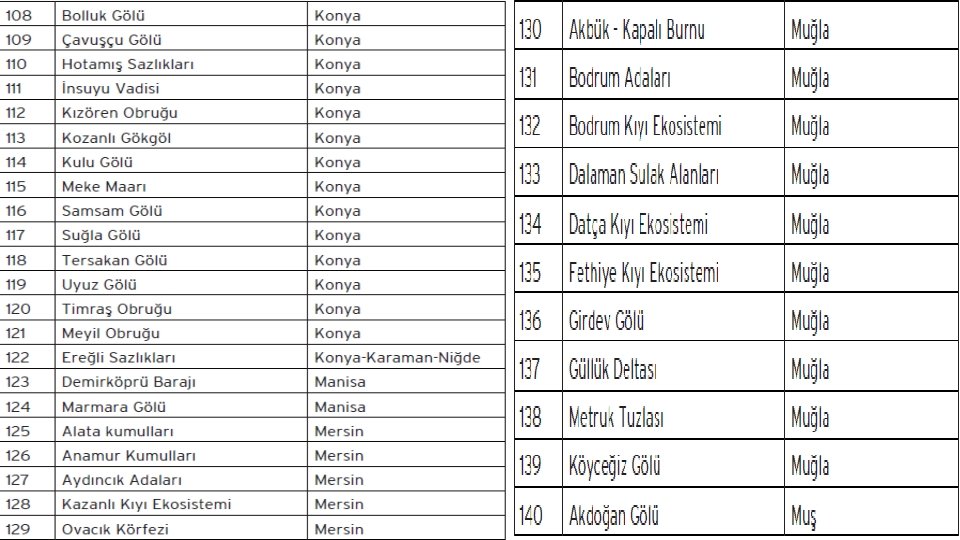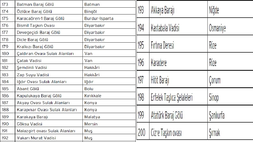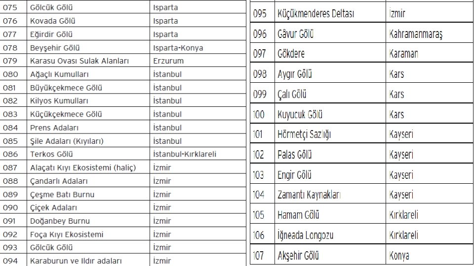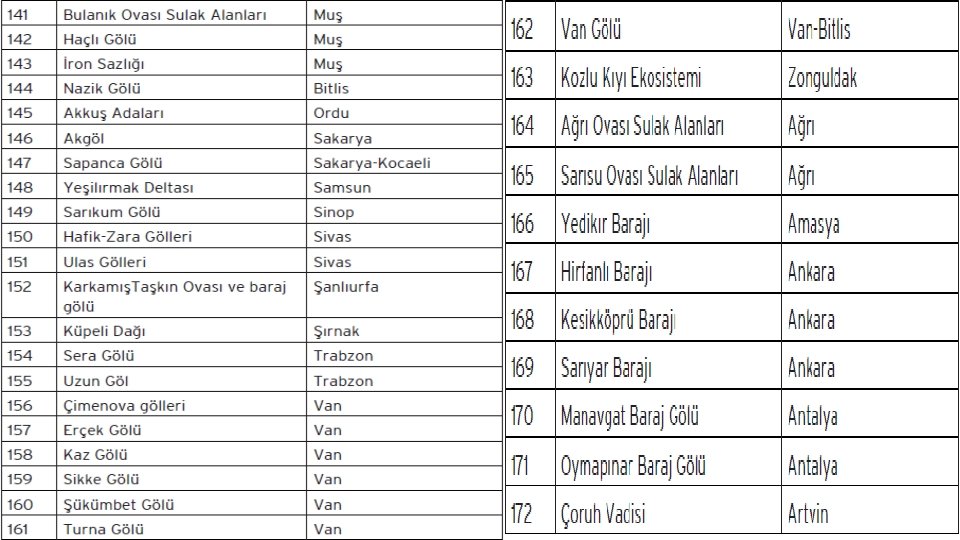 • Başta karayolları olmak üzere yollar • Kanallar ve drenaj sistemleri • Toplumsal baskının siyasi erke etki ederek planlamanın sulak alanlar zararına değiştirilmesi • Yetersiz denetim Türkiye, Ramsar Sözleşmesi ile başta listeye dahil ettirdiği 9 sulak alan olmak üzere, sınırları dahilindeki tüm sulak alanları korumayı, geliştirmeyi ve akılcı kullanmayı taahhüt etmiştir. Ülkemizin listeye dahil edilen 9 adet Ramsar Alanı ile ilgili özet bilgi aşağıda verilmektedir.