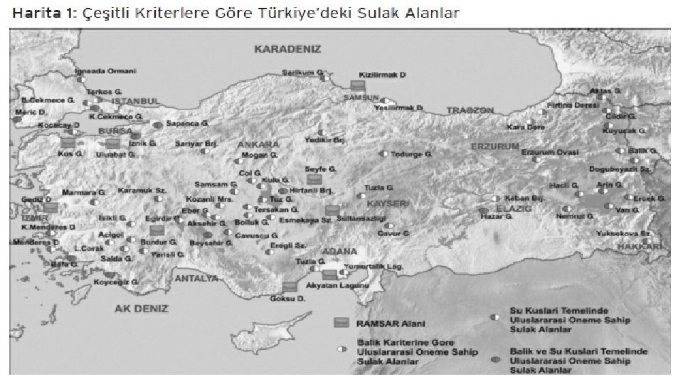 Haritada görüldüğü gibi Türkiye sahip olduğu sulak alanları (Ramsar Alanı + Potansiyel Ramsar Alanları) sahip oldukları özelliklere göre ayrı bir kategoride sınıflandırmıştır. Türkiye’nin sınıflandırması şöyledir: • Ramsar Alanları (Uluslararası anlaşma gereği öncelikli olarak belirlenen ve koruma statüsüne alınan bölgeler), • Su Kuşları Temelinde Uluslararası Öneme Sahip Sulak Alanlar, • Balık Kriterlerine Göre Uluslararası Öneme Sahip Sulak Alanlar, • Balık ve Su Kuşları Temelinde Uluslararası Öneme Sahip Sulak Alanlar.