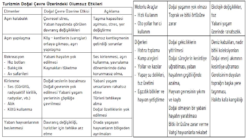 Turizmin Fiziksel Çevre Üzerindeki Olumsuz Etkileri Şüphesiz, iyi planlanmadığı takdirde turistik gelişmeler, çevrede olumsuz etkiler yaratır. Bu etkiler, geliştirilen turizm türüne bağlı olduğu gibi, bu gelişmenin boyutuna ve gelişmenin olduğu alanın özelliklerine göre de değişiklik gösterir. Çevrenin taşıma kapasitesine bağlı olan turizm gelişmesinin boyutu, çevresel etkinin boyutunu önemli bir şekilde etkiler. Turizmin çevre üzerine olumsuz etkileri şu şekilde sıralanabilir: • Kirlilik > Su Kirliliği: Turizm gelişmesindeki en önemli olumsuz etkiler deniz sularında görülebilir. Özellikle turizm sezonunun yoğun olduğu dönemlerde aşırı su kullanımıyla beraber oteller, restoranlar ve diğer turizm tesisleri için uygun kanalizasyon sistemleri oluşturulmadığı takdirde, bu tesislerin atıkları yer altı sularının kirlenmesine neden olur. Motorlu botlar gibi rekreasyonel ve turistik taşıma araçlarının nehir, göl ve deniz gibi yerlerde kullanılmaları, yağ ve gaz sızıntıları gibi nedenlerden dolayı bu suların kirlenmesine de neden olabilmektedir.