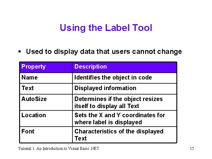 Using the Label Tool § The tools in the toolbox allow you to create objects, called controls, that can be displayed on a form § You use the Label tool to create a label control § The purpose of a label control is to display text that the user is not allowed to edit while the application is running § Assigning meaningful names to the controls on a form will help you keep track of the various controls in the user interface Tutorial 1: An Introduction to Visual Basic. NET 14