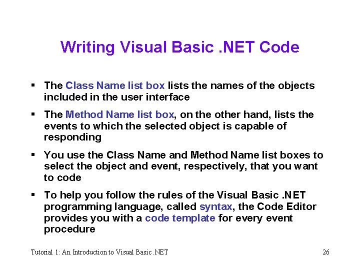 Writing Visual Basic. NET Code § Actions—such as clicking, double-clicking, and scrolling—are called events § The set of Visual Basic. NET instructions, or code, that tells an object how to respond to an event is called an event procedure § A class definition is simply a block of code that specifies (or defines) the attributes and behaviors of an object § When you start the application, Visual Basic. NET uses the class definition to create the object Tutorial 1: An Introduction to Visual Basic. NET 25
