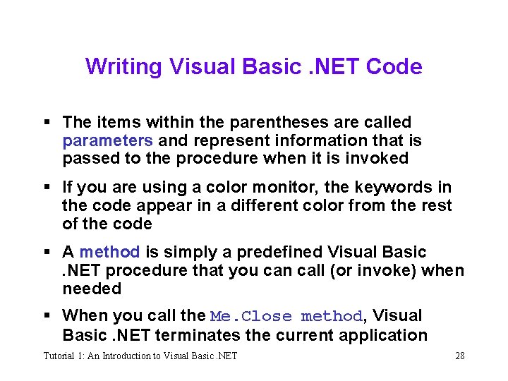 Writing Visual Basic. NET Code § The first line in the Code template is called the procedure header § And the last line is called the procedure footer § A keyword is a word that has a special meaning in a programming language § The Sub keyword is an abbreviation of the term sub procedure, which, in programming terminology, refers to a block of code that performs a specific task § The Private keyword indicates that the procedure can be used only within the class in which it is defined Tutorial 1: An Introduction to Visual Basic. NET 27