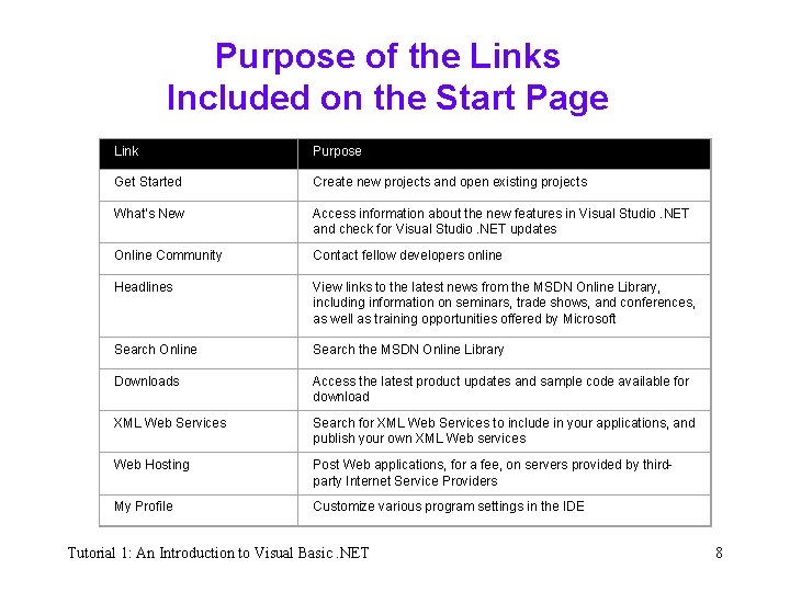 Purpose of the Links Included on the Start Page Link Purpose Get Started Create new projects and open existing projects What’s New Access information about the new features in Visual Studio. NET and check for Visual Studio. NET updates Online Community Contact fellow developers online Headlines View links to the latest news from the MSDN Online Library, including information on seminars, trade shows, and conferences, as well as training opportunities offered by Microsoft Search Online Search the MSDN Online Library Downloads Access the latest product updates and sample code available for download XML Web Services Search for XML Web Services to include in your applications, and publish your own XML Web services Web Hosting Post Web applications, for a fee, on servers provided by thirdparty Internet Service Providers My Profile Customize various program settings in the IDE Tutorial 1: An Introduction to Visual Basic. NET 8