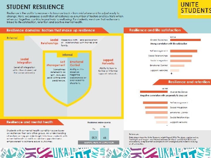 AMOSSHE/UNITE Student Resilience Toolkit • Employed a researcher to gather together a Student Resilience Toolkit for the UK HE sector. Resilience is a preventative approach to student wellbeing as defined in the ‘Exploring the positive case for resilience’, Mc. Intosh & Shaw 2017 • Items for inclusion in the toolkit should primarily be sourced from the UK higher education sector, but may also include items from other comparable HE systems (e. g. Australia, US) and be of interest and use to professionals working in higher education, primarily student services professionals but also academic tutors, senior leaders etc • Items may be case studies, research reports, intervention tools, learning materials or similar. Academic papers can be included where they have the potential to help professionals develop their practice in supporting student resilience. Thought pieces without any underpinning evidence base are out of scope.