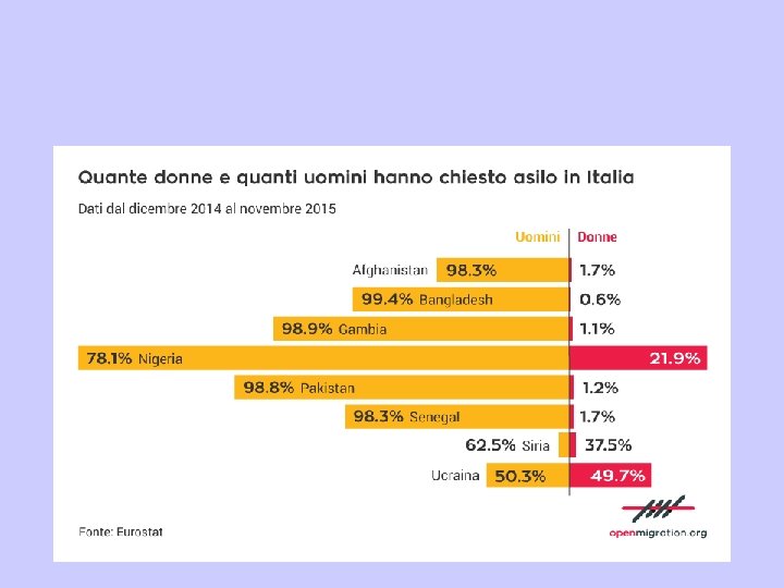 Donne e uomini Tra i pakistani arrivati nel 2015 i maschi sono quasi 10 mila pari al 98, 6%, quelli arrivati dal Gambia 8. 435 (98, 9%), i senegalesi 6. 395 (98, 3%) e quelli del Bangladesh addirittura 6. 170 uomini e solo 40 donne richiedenti asilo, pari allo 0, 6%.