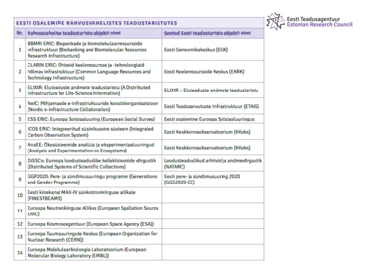 Taotluste hindamine ETAg juurde moodustatav tuumiktaristu komisjon hindab taotlusi ja teeb ETAgile ettepaneku taotluste rahuldamise, osalise rahuldamise või mitterahudamise kohta Hinnatakse: • Eesmärke ja olulisust • Kasutust • Jätkusuutlikkust • Toetuse mahu põhjendatust • Taristu toimimiseks vajalike lubade, litsentside, standardite olemasolu • Rahvusvahelist koostööd