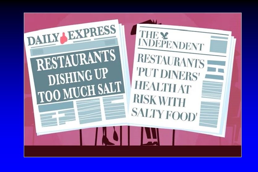 CASH çalışmaları (2011) l Christmas akşam yemeği, Ekmek, sucuk- sosis, pasta, Sevgililer günü yemekleri, Gurme tuzları (kaya, deniz) l Rock and sea salts are just as high in sodium chloride as table salt so are just as bad for our health l Health claims on labels fuel confusion by saying they are a healthier alternative