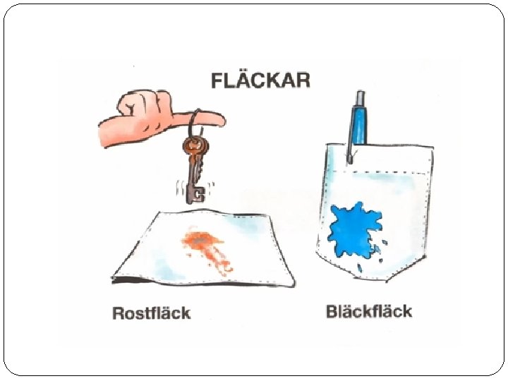 Vad kan man göra om man fått en fläck? �Sök information om hur man får bort fläcken t. ex. om det är blod, vin, kaffe etc. �Använda speciella fläckborttagningsmedel t. ex. Vanish