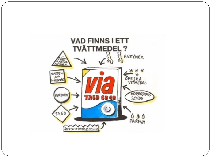 Vad händer i en tvättmaskin? � 1. Kläderna stoppas in i en så kallad ”trumma” � 2. Luckan stängs och trumman fylls med vatten, sedan snurrar trumman fram och tillbaka � 3. Vattnet värms upp till önskad temperatur � 4. Tvättmedel tillsätts och trumman snurrar på � 5. Maskinen töms på varmt vatten och fylls på med kallt � 6. En rad olika sköljningar i kallt vatten sker (för att ta bort tvättmedlet) � 7. Den sista sköljningen tillsätter eventuellt sköljmedel � 8. Tvättmaskinen centrifugerar = trumman snurrar på i hög fart för att vrida ur allt vatten från