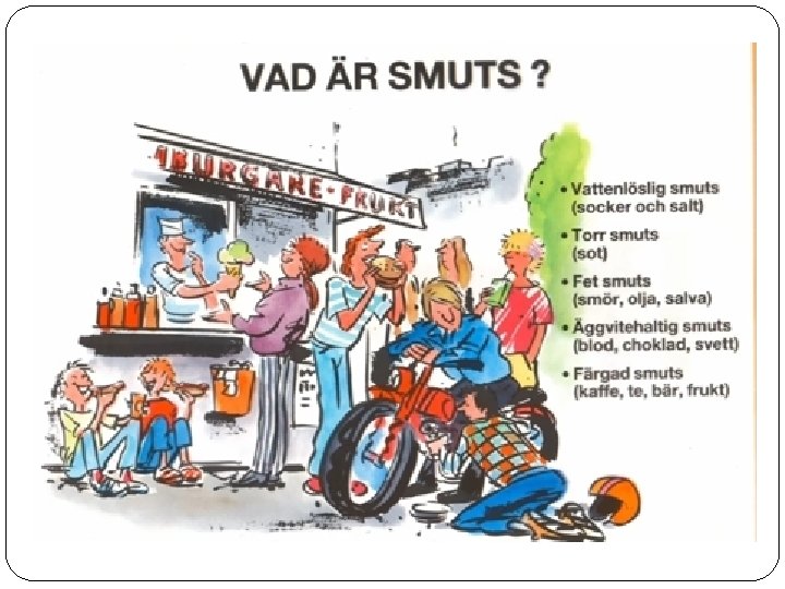 Icke vattenlöslig smuts �Icke vattenlöslig smuts är t. ex. damm, sot, olja, hudkräm �Löses upp av särskilda medel (tvättmedel etc. )