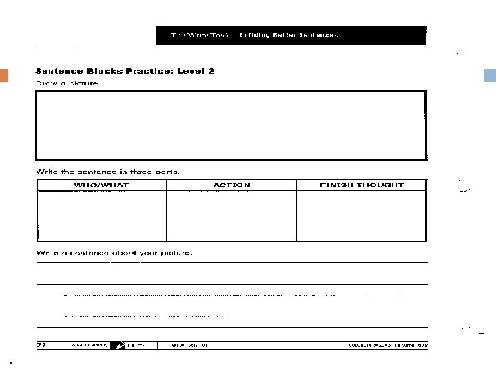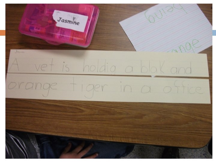 Protocol for Building Better Sentences Provide students with a simple, interesting picture Helps students “paint pictures with words” q Ask students to orally tell you what is happening in the picture Record their responses Examine three parts of a sentence Use chart to identify “who” (noun it), “action” (verb it), and “finish thought” of student responses Expand sentences to enhance word choice, sentence fluency, and grammar