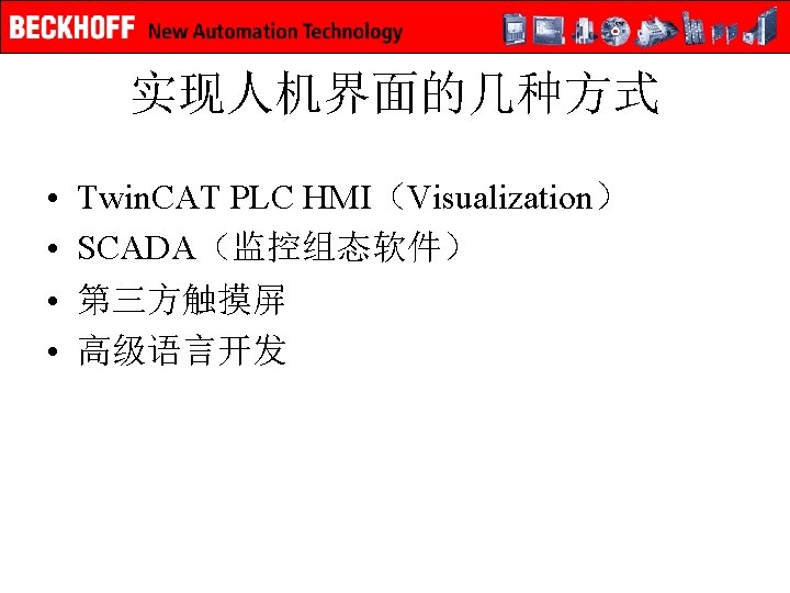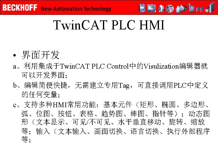 Twin. CAT PLC HMI • Target Visulization PC BK or BC Target Visulization运行于CE系 统的CX控制器中,CX控制器中 需安装Twin. CAT Target Visu. CE 软件包,通过CX控制器的显示接 口和USB接口外接显示器和鼠标 键盘等外设实现界面的监控。 BX DVI/USB CX