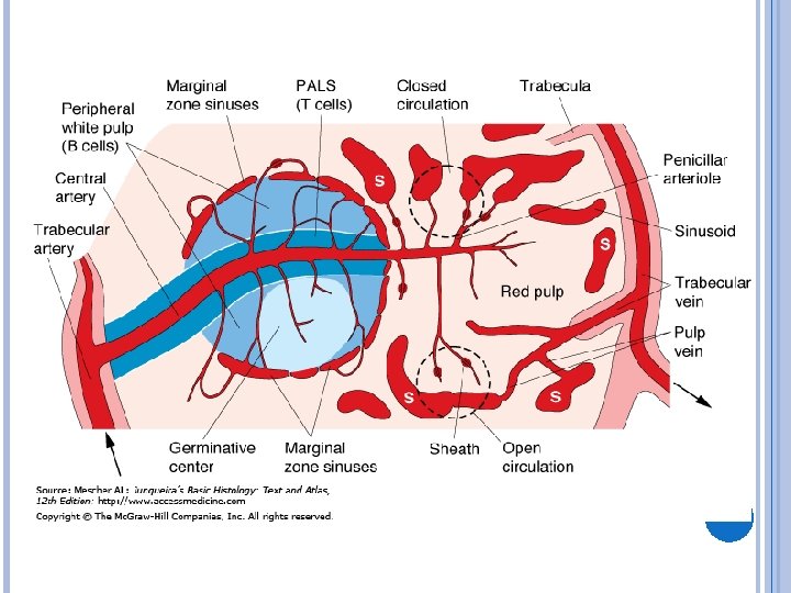 The spleen is the major organ of RES. Blood cells leave the splenic arterial bed through afferent arterioles , which pass through lymphoid nodules(white pulp) and then terminates in the cords of Billroth(red pulp) into which the blood cells are discharged The normal slow flow permits selective action on the blood cells by macrophages