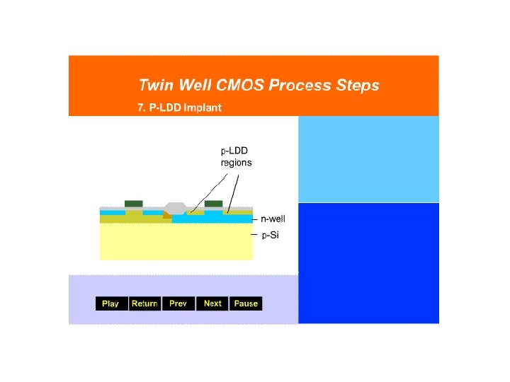 7. P-Lightly Doped Drain (LDD) Implant A photolithography step is used to cover the n-MOS part of the structure. A low dose boron implantation is performed to form the self-aligned, lightly-doped drainsource extension regions of the p. MOS.