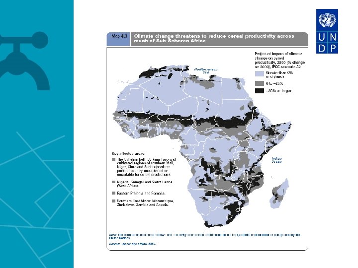 Global Warming – the predictable emergency • • • For a large share of the world’s poor people climate change projections point to less secure livelihoods, greater vulnerability to hunger and poverty, worsening inequalities and causing more environmental degradation. Water insecurity linked to climate change threatens to increase malnutrition by 75 -120 million people by 2080. Staple food production in many Sub-Saharan African countries would fall by more than 25% by 2080. Mitigation through incentives to clean technology and financing technological transfer is an imperative. The international response has been weak on adaptation. Very few countries have included in their PRSPs or IWRM documents provisions to face up to the challenges caused by climate change.