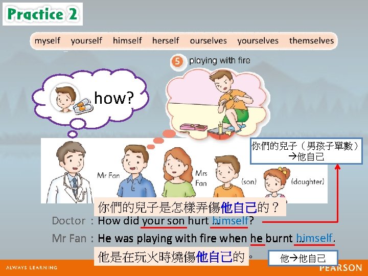 how? (son) (daughters) 你兒子是怎樣弄傷他自己的? Doctor : How did your son hurt … himself? himself. Mrs Wu : He was making model planes when he cut … 他是在砌模型飛機時割傷他自己的。