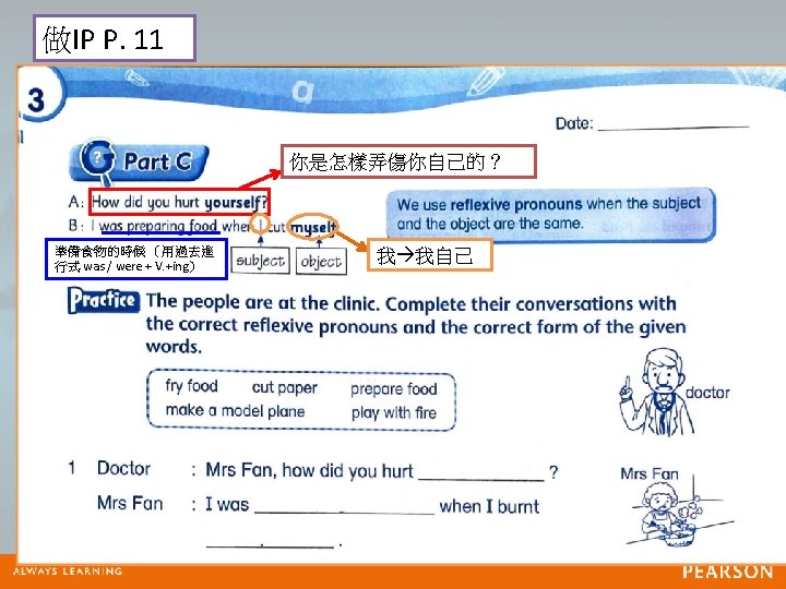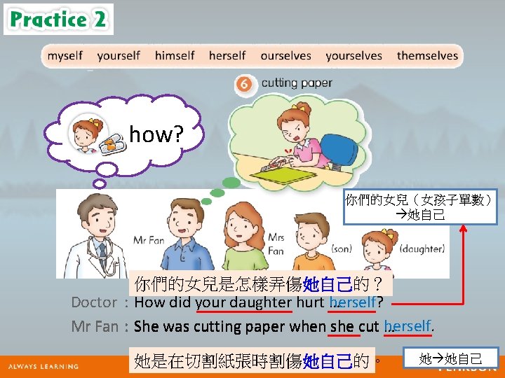 how? (son) (daughters) 兩個女兒 你的兩個女兒是怎樣弄傷她們自己的 Doctor : ? How did your daughters hurt … themselves? 她們自己 Mrs Wu : They were preparing food when they cut … themselves. 她們 她們 他們是在準備食物時切傷她們自己的。 自己