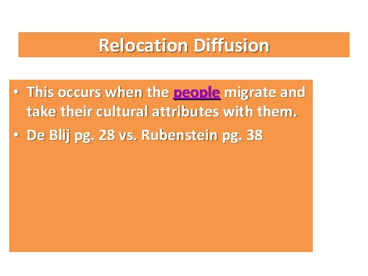 Relocation Diffusion • This occurs when the people migrate and take their cultural attributes with them. • De Blij pg. 28 vs. Rubenstein pg. 38