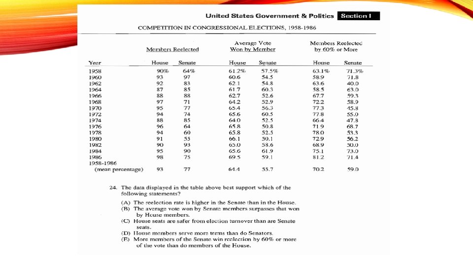 INCUMBENCY ADVANTAGE • Incumbents: a person seeking reelection for office • Over 90% of incumbents in the House won re-election • Over 75% in Senate