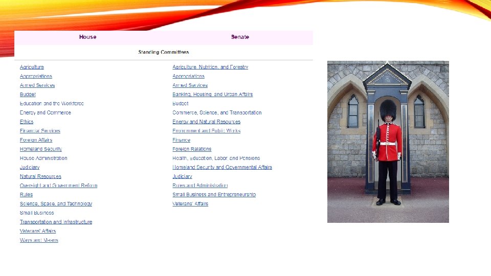 STANDING COMMITTEES • Permanent – 20 in House; 16 in Senate • Organized by subject/policy area • Membership decided by party leaders • Bills must first go through here before being considered by entire House – ‘gatekeepers’– sets legislative agenda • Oversight—monitor agencies, programs, and activities related to subject area • Recommends funds for government operations