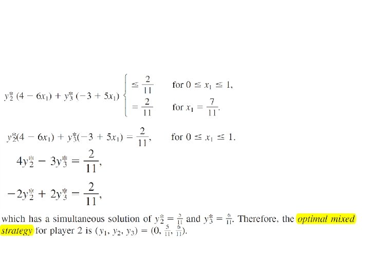 GRAPHICAL SOLUTION Ø According to the definition of the minimax value Vmax and the minimax theorem, the expected payoff resulting from the optimal strategy (y 1, y 2, y 3) = (y*1, y*2, y*3) will satisfy the condition Furthermore, when player 1 is playing optimally (that is, x 1=7/11), this inequality will be an equality (by the minimax theorem), so that Because (y 1, y 2, y 3) is a probability distribution, it is also known that Therefore, y*1= 0 because y*1> 0 would violate the next-to-last equation