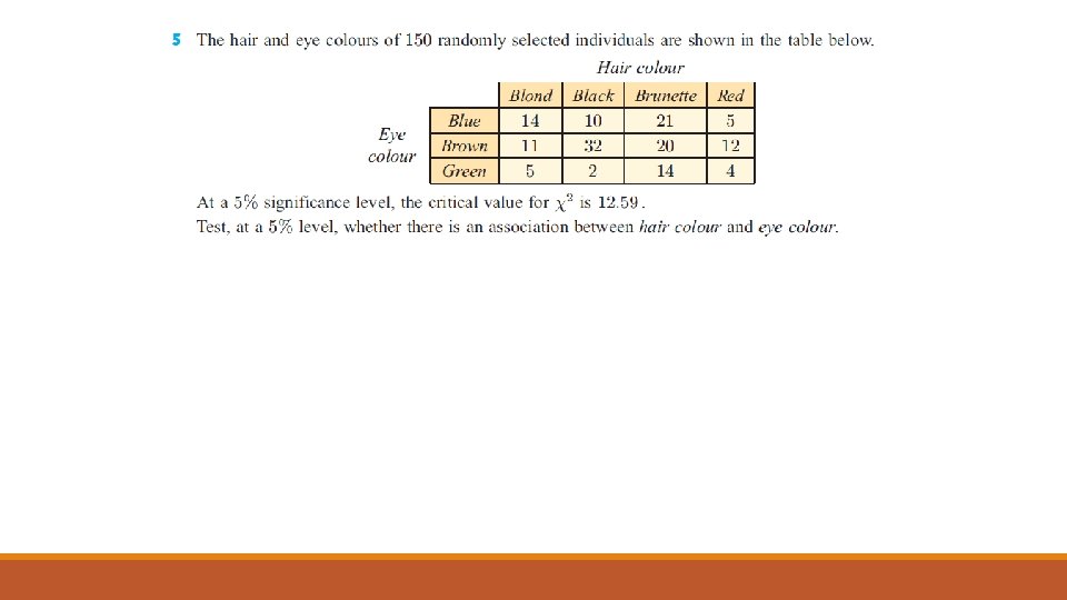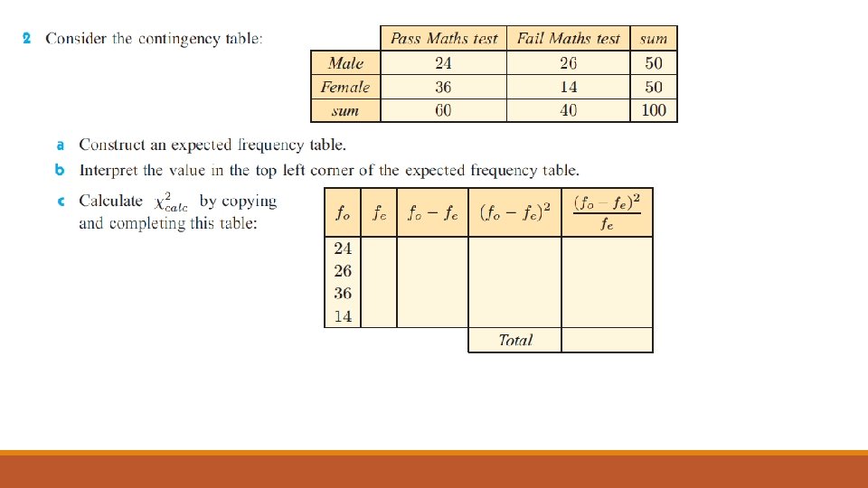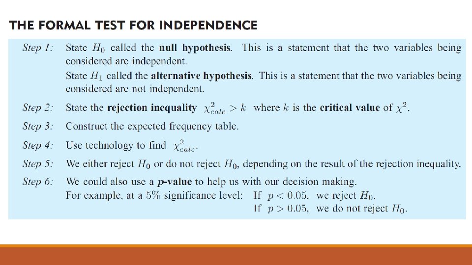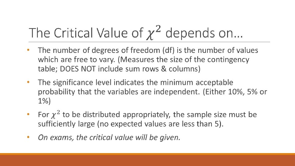• Complete an expected frequency table. • Square the difference between observed & expected values, and divide it by the expected value. • Find the sum of these values. • Smaller than critical value = independent • Larger than critical value = not independent