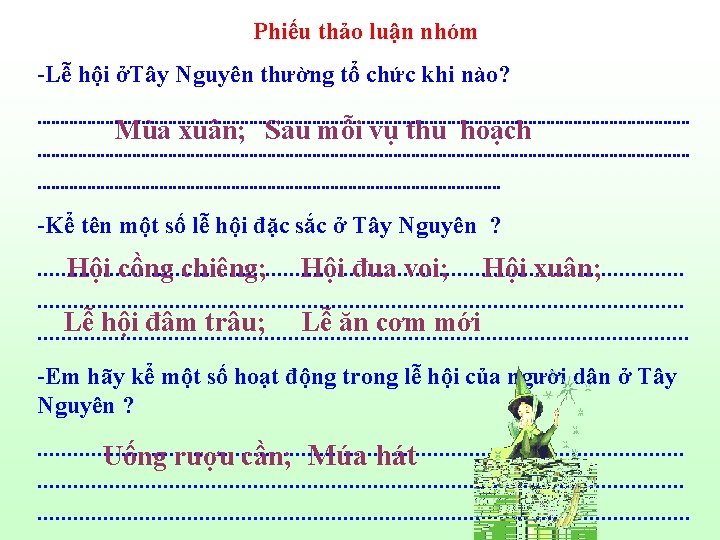 1. Tây Nguyên-nơi có nhiều dân tộc chung sống. - Tây Nguyên - nơi có nhiều dân tộc chung sống, là nơi thưa dân nhất nước ta. - Các dân tộc Tây Nguyên sống tập trung thành các buôn. 2. Nhà rông ở Tây Nguyên Ngôi nhà chung lớn nhất của buôn, nhà rông to đẹp chứng tỏ buôn càng giàu có , thịnh vượng. 3. Trang phục-lễ hội