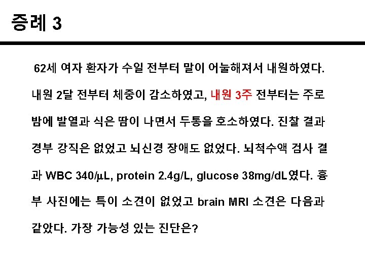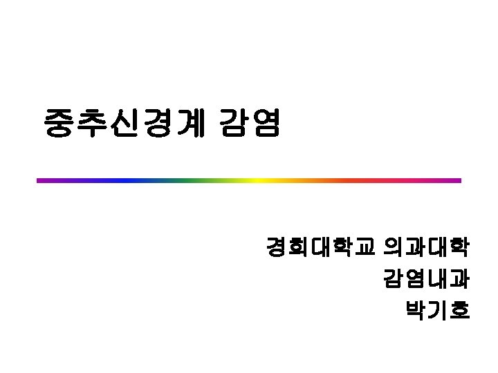 CSF finding by type of meningitis Pressure (mm. H 2 O) Acute meningitis Subacute~chronic meningitis Normal Bacteria Virus Tuberculosis Cryptococcus 90 -180 N- WBC/mm 3 0 -5 > 1, 000 5 -1, 000 25 -500 % PMNs 0 -15 90 < 50* 10 -1, 000 (평균 50) < 50 Protein (mg/d. L) 20 -50 100 -500 100 -200 20 -500 Glucose (mg/d. L) 40 -70 < 40 N** (< 40 in 3/4) (< 30) 0. 6 < 0. 4 0. 6 CSF/serum glucose Gram stain, culture N- (50 -100) PCR * Lymphocyte가 우세하지만, 초기에는 PMN 80%까지 가능 ** Mumps, HSV, CMV 중 1/4에서 감소 AFB stain TB-PCR Mycobacteri al culture Indian ink Cryptococcal latex agglutination test