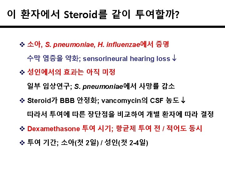 S. pneumoniae meningitis의 항균제 CSF, blood: S. pneumoniea 동정 PCN MIC 0. 03 (S), Ceftriaxone MIC 0. 5 (S) Penicillin MIC Standard therapy 0. 06 g/m. L (S) Penicillin 0. 06 -1. 0 g/m. L (I) Cefotaxime or ceftriaxone ≥ 2. 0 g/m. L (R) Vancomycin plus (Cefotaxime or ceftriaxone) Tunkel AR, et al. Clin Infect Dis 2004; 39: 1267 -84