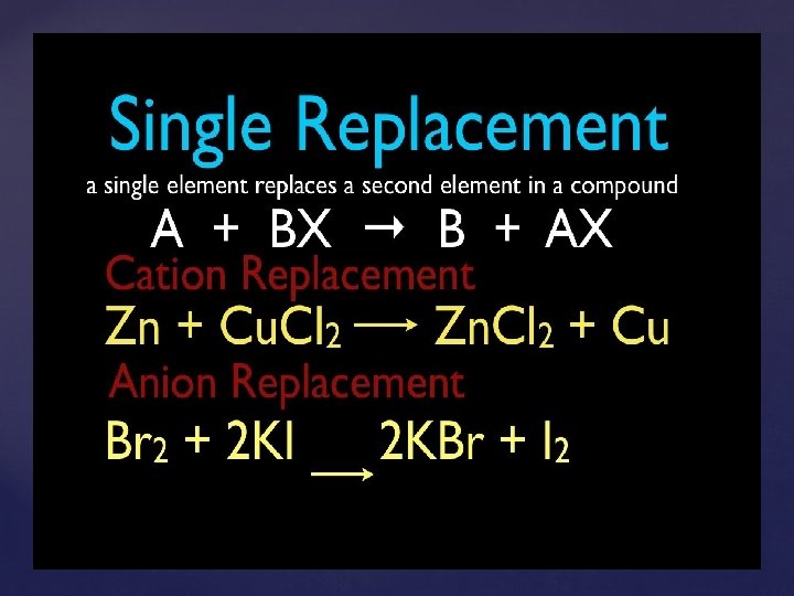 Single Replacement Reactions A + BX BX + Y Replacement of: AX + B BY + X Metals by another metal Hydrogen in water by a metal Hydrogen in an acid by a metal Halogens by more reactive halogens