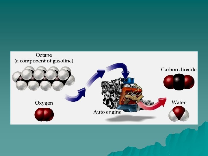 Combustion of Fuel Let’s look at what happens in a carburetor/fuel injector when gasoline is burned. This exothermic reaction produces lots of heat energy and carbon dioxide gas and water vapor that drives the pistons to rotate a turbine. This turns the drive shaft, which is transferred into tire rotation. The accelerator is what regulates the amount of fuel entering the engine to be burned.