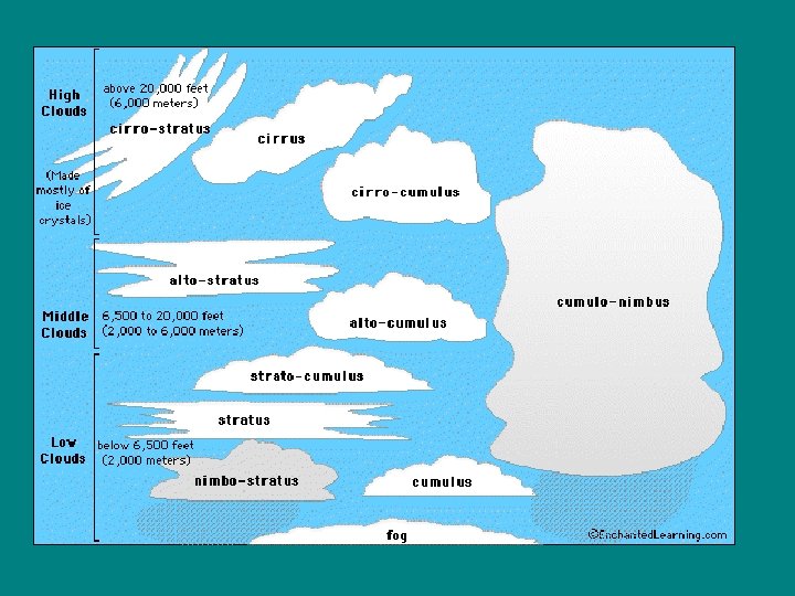 Cumulonimbus Clouds • These clouds are named because they are puffy ("cumulo") and because they often are dark clouds which cause rainstorms ("nimbus"). • Cumulonimbus clouds are different because they cannot be classified as low, middle or high altitude clouds. • These are often storm clouds which can be ten or more miles in height, extending through all the levels of altitude. • These clouds form when a front of cool air meets a body of hot, moist air. • Cumulonimbus clouds can produce rain showers, snow showers, hail, or even thunderstorms