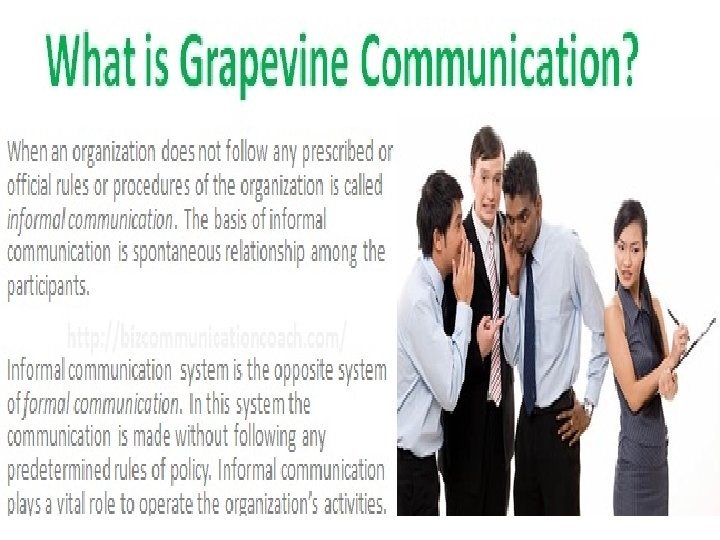 Informal Communication • Arises out of all those channels that fall outside the formal channels and it is also known as grapevine. • Established around the societal affiliation of members of the organization. • Does not follow authority lines as in the case of formal communication.