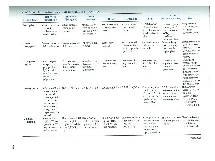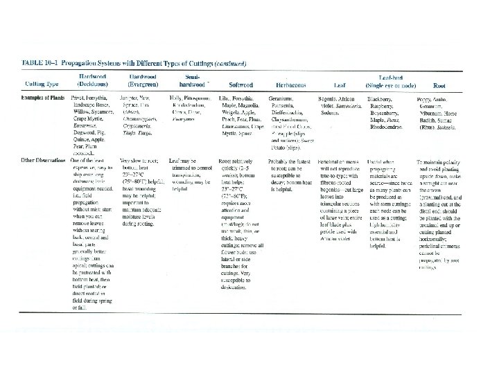 Types of cuttings • Stem cuttings – Hardwood • Deciduous • Narrow-leaved evergreen – Semi-hardwood – Softwood – Herbaceous • Leaf cuttings • Leaf-bud cuttings (single-eye or single-node) • Root cuttings