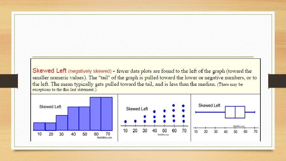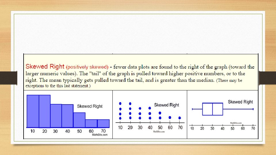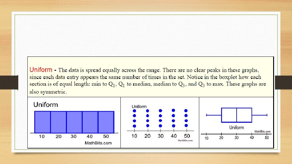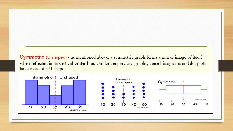 Distributions of Data • When graphed, the data in a set is arranged to show the points are distributed throughout the set. These distributions show the spread (dispersion, variability, scatter) of the data. The spread may be stretched (covering a wider range) or squeezed (covering a narrower range). • The shape of a distribution is described by its number of peaks and by its possession of symmetry, its tendency to skew, or its uniformity. (Distributions that are skewed have more points plotted on one side of the graph than on the other. )