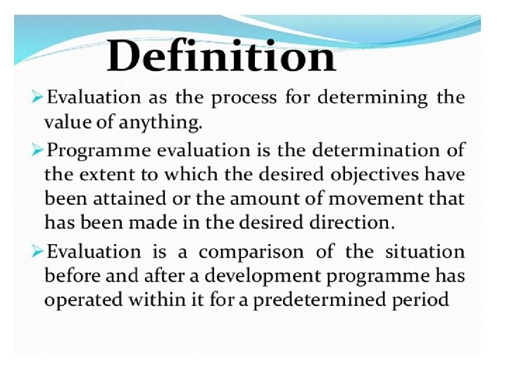 Assessment: Evaluation assessment considers value, • merit, worth, significance or quality. It may aim to identify what works, for whom, in • what respects, to what extent, in what contexts, and how