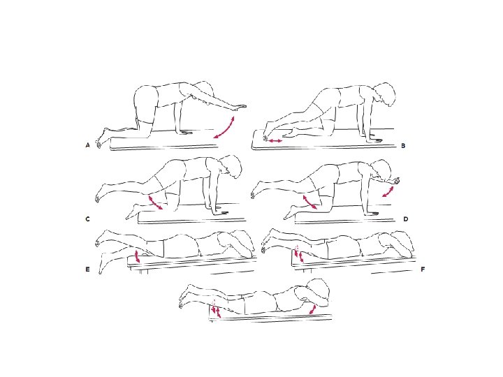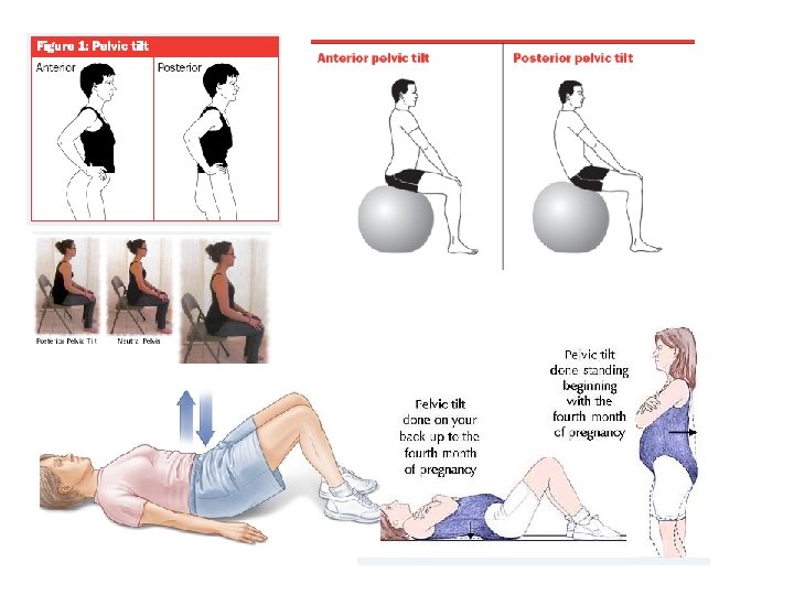 Pelvic tilt exercises • Begin in quadruped (on hands and knees). • Instruct the patient to perform a posterior pelvic tilt. While the patient keeps her back straight, have her isometrically tighten (imagine drawing in) the lower abdominals and hold, then release and perform an anterior tilt through very small range.