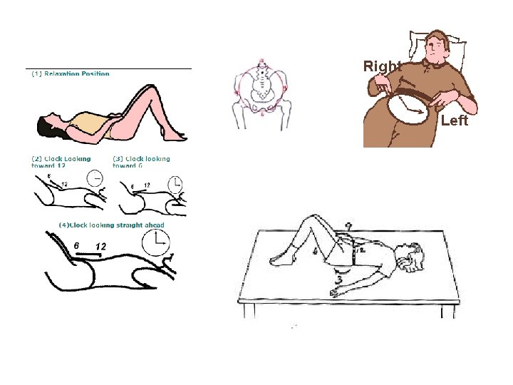 Pelvic clock • With the woman hook-lying, ask her to visualize the face of a clock on her lower abdomen. The umbilicus is 12 o’clock and the pubic symphysis is 6 o’clock. The patient’s legs may move slightly while performing this exercise. • Have her begin with gentle movements back and forth between 12 and 6 o’clock (the basic pelvic tilt exercise). • Then ask her to move back and forth between 3 o’clock (weight shifted to left hip) and 9 o’clock (weight shifted to the right hip). • Then move in a clockwise manner from 12 to 3 to 6 to 9 and then back to 12 o’clock, then reverse.