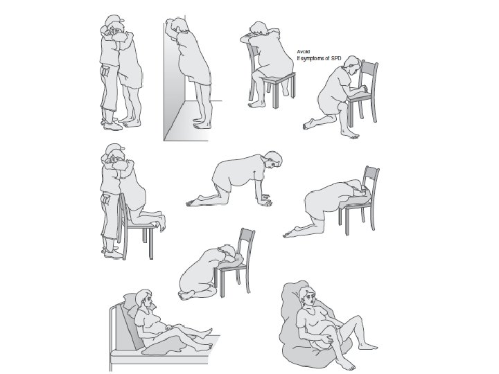 Unilateral weight-bearing activities • Weight bearing on one leg (which includes slouched standing with the majority of weight shifted to one leg and the pelvis tilted down on the opposite side) during pregnancy can cause sacroiliac joint irritation and should be avoided by women with preexisting sacroiliac joint symptoms. • Unilateral weight bearing also can cause balance problems because of the increasing body weight and shifting of the center of gravity. • This posture becomes a significant problem postpartum when the woman carries her growing child on one hip. Any asymmetries become accentuated, and painful symptoms may develop.