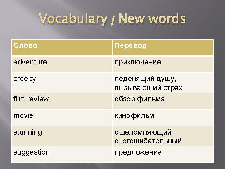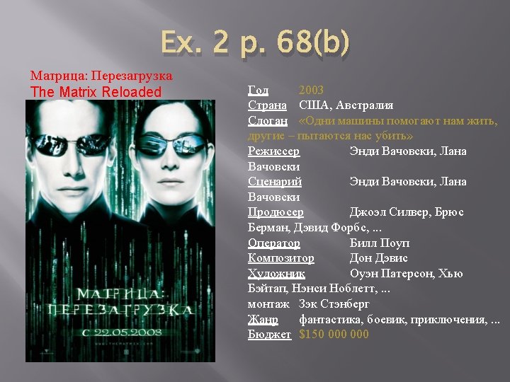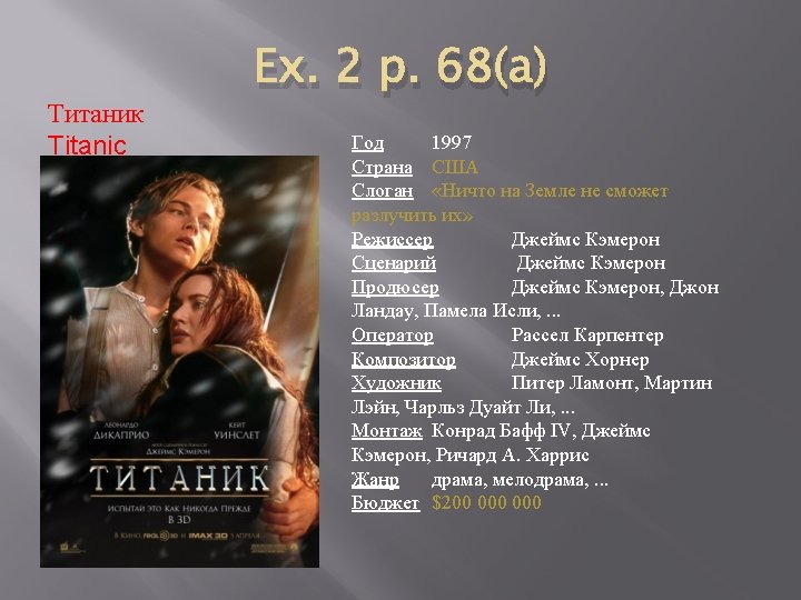 Check yourself Ex. 1 p. 68 Types of films Titanic Lord of the Rings: The Return of the King The films romance fantasy The Matrix Reloaded Shrek 2 Braveheart The Sixth Sense Home Alone science fiction animation adventure thriller comedy