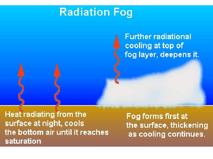• Radiation fog generally forms when the air near the surface cools to its saturation temperature due to radiational cooling at night when the sun has set. • We start with a clear evening with moderate or high humidity and light winds. As the sun's energy diminishes at dusk, the ground surface radiates its heat away faster than it can gain it from other sources, and thus its temperature drops. The cool surface then cools the air in contact with it. Throughout the night, the surface and overlying air continue to cool (unless warmer air moves in, or a cloud deck forms above); the degree of cooling depends on several factors including cloud cover, wind speed and number of hours of darkness. • If the air reaches its condensation, or dewpoint, temperature during that nocturnal cooling, fog will form. A wet surface — moist soil or pools of standing water — significantly increases the chances of radiation fog formation, so the radiation fog potential is high after a rainfall, particularly if followed by a cold front which clears the skies and lowers the air temperature. Radiation fog is not as common over water surfaces since the cooling of the water surface by radiation is much slower during the night than the cooling occurring over the land.
