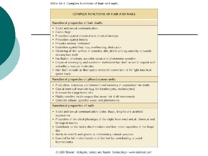 TYPES OF HAİR ¡ ¡ ¡ Lanugo hair: Soft fine hair that covers much of fetus; usually shed before birth Vellus hair: Fine, nonpigmented hair that covers the body of children and adults; growth not affected by hormones. Terminal hair: Thick pigmented hair found on scalp, beard, axillae, pubic area; growth is influenced by hormones. Eyebrow/eyelash hair are terminal hairs.