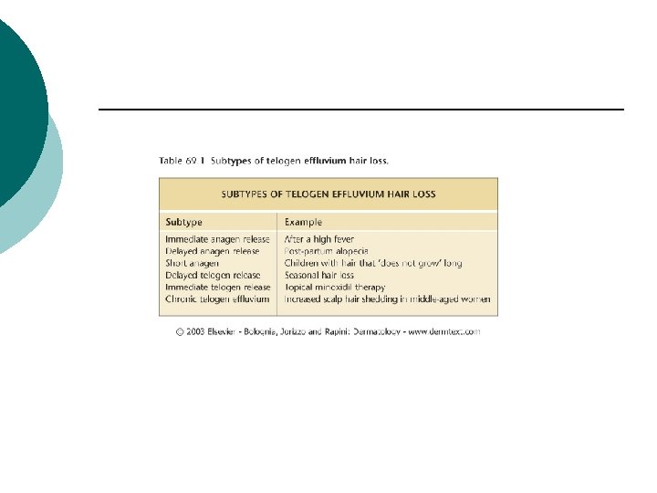 Etiology ¡ Endocrine l l l ¡ Nutritional l l ¡ ¡ Deficiency: biotin, zinc, iron, essential fatty acids Deprivation: caloric, protein Drugs l ¡ Hypo- or hyperthroidism Postpartum Peri- or postmenopausal state Antimitotic agents (dose dependent): cancer chemotherapy, benzimidazoles Antihypertensives: ACE inhibitors, beta blockers Anticoagulants Interferon CMS drugs: lithium, valproic acid Hormonal: oral contraceptives Retinoid effect: vitamin A excess, retinoids, indinavir Physical stress: anemia, surgery, systemic illness Psychological stress Idiopathic: no obvious cause is apparent in a significant number of cases.