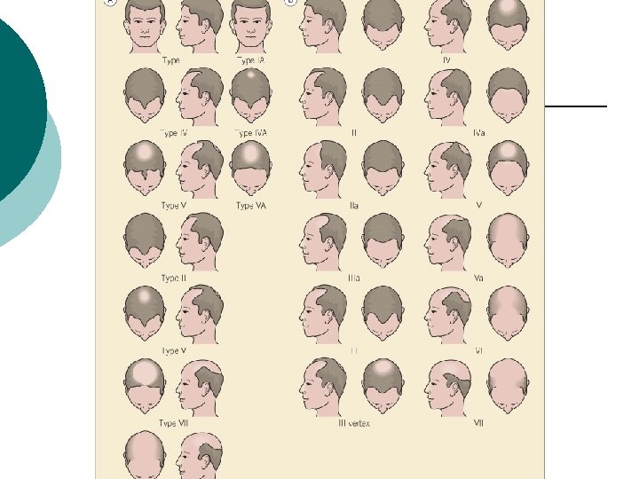 Physical examination Skin findings: Scalp skin is normal. With advanced AGA, scalp is smooth and shiny. ¡ Distribution: Hamilton classified malepattern hair loss into V stages; Ludwig classified hair loss in females. ¡