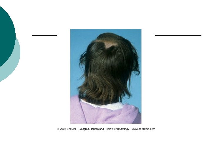 Physical Examination ¡ ¡ Skin findings: Usually none. Possibly minimal erythema in area of hair loss. Hair: Alpocia, normal- appearing skin. No scarring, no atrophy; Alopecia often sharply defined. Sometimes hair loss in AAT may follow a diffuse (noncircumscribed) pattern. Sites of Predilection: Scalp, eyebrows, eyelashes, pubic hair, beard. Nails: Fine pitting, mottled lunula, trachyonychia (rough nails), onychomadesis